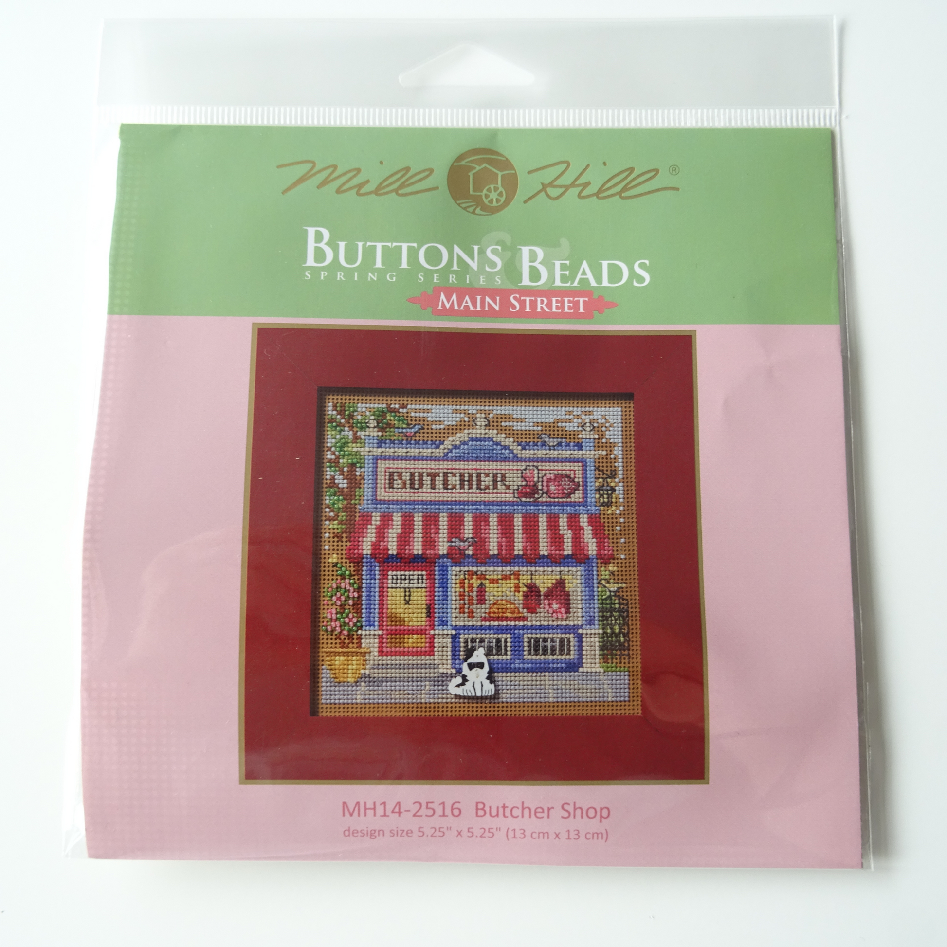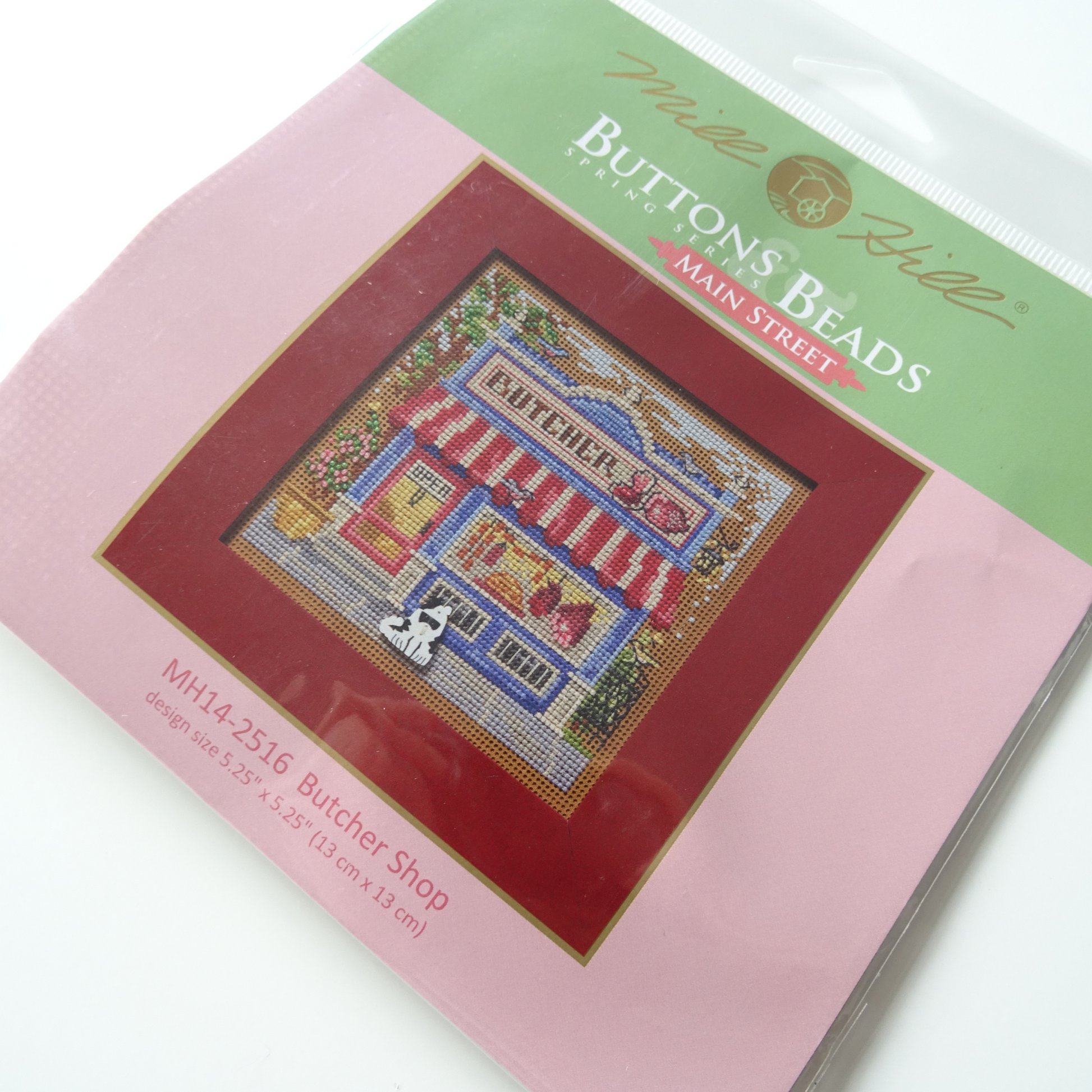 This kit is of the front of a cute village butchers shop with a dog charm sitting at the front.