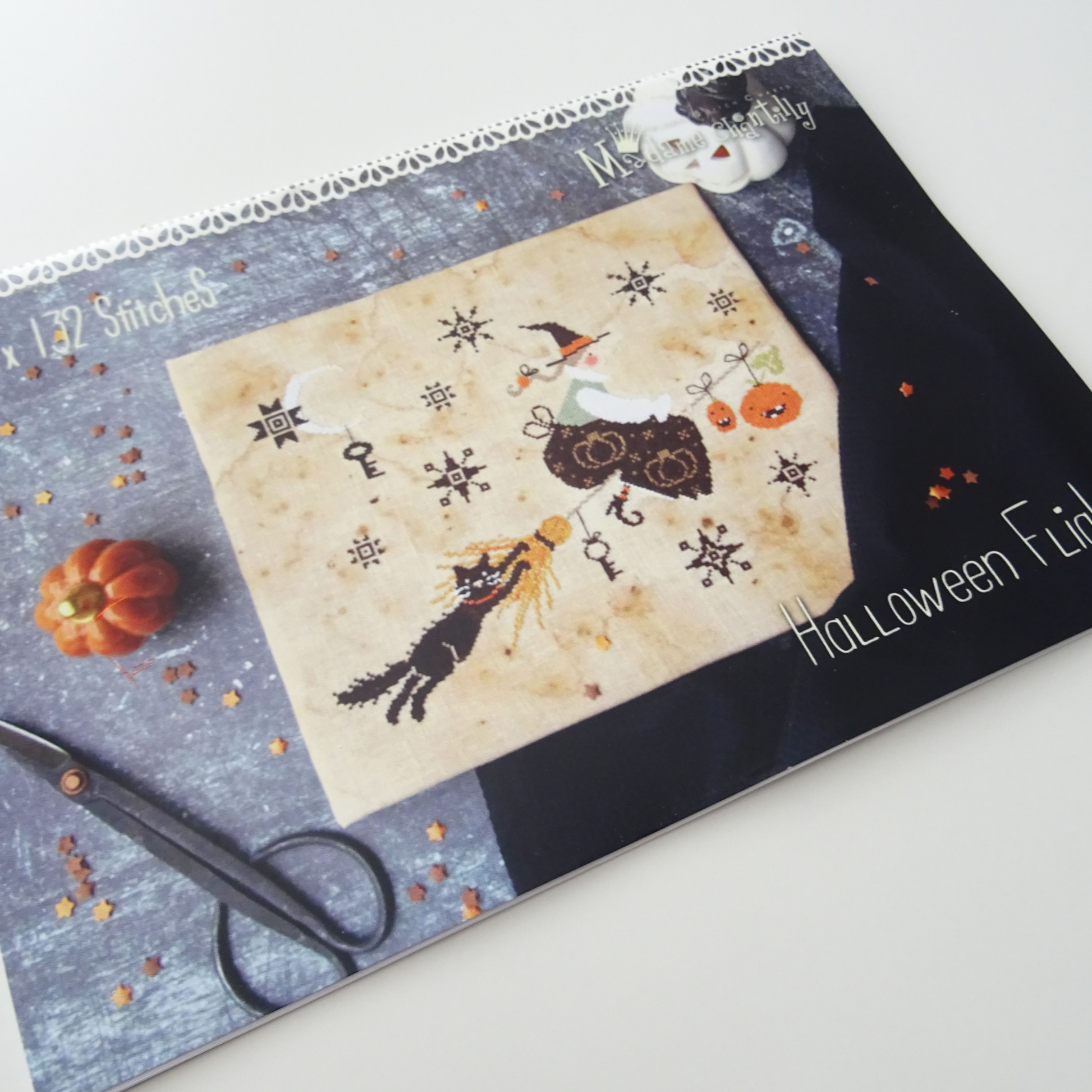 Halloween Flight counted cross stitch pattern by Madame Chantilly. This chart was released during this years Needlework Marketplace. It shows a cute witch on her broom with her black cat holding on behind, with lots of pretty Quaker motifs.