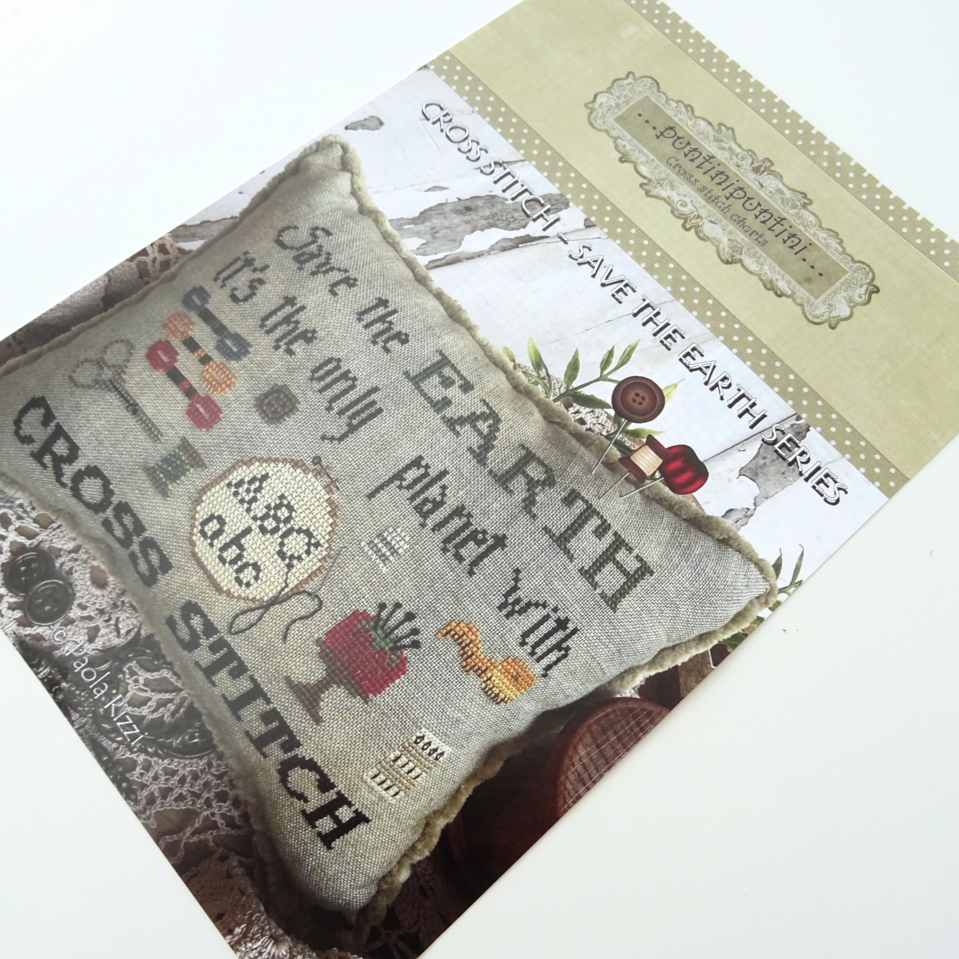 Save The Earth Series counted cross stitch pattern by Puntini Puntini. This chart was released during the Needlework Marketplace. The chart shows all the bits and bobs associated with cross stitch including thread, scissors, needles etc. It also says 'save the earth it's the only planet with cross stitch.