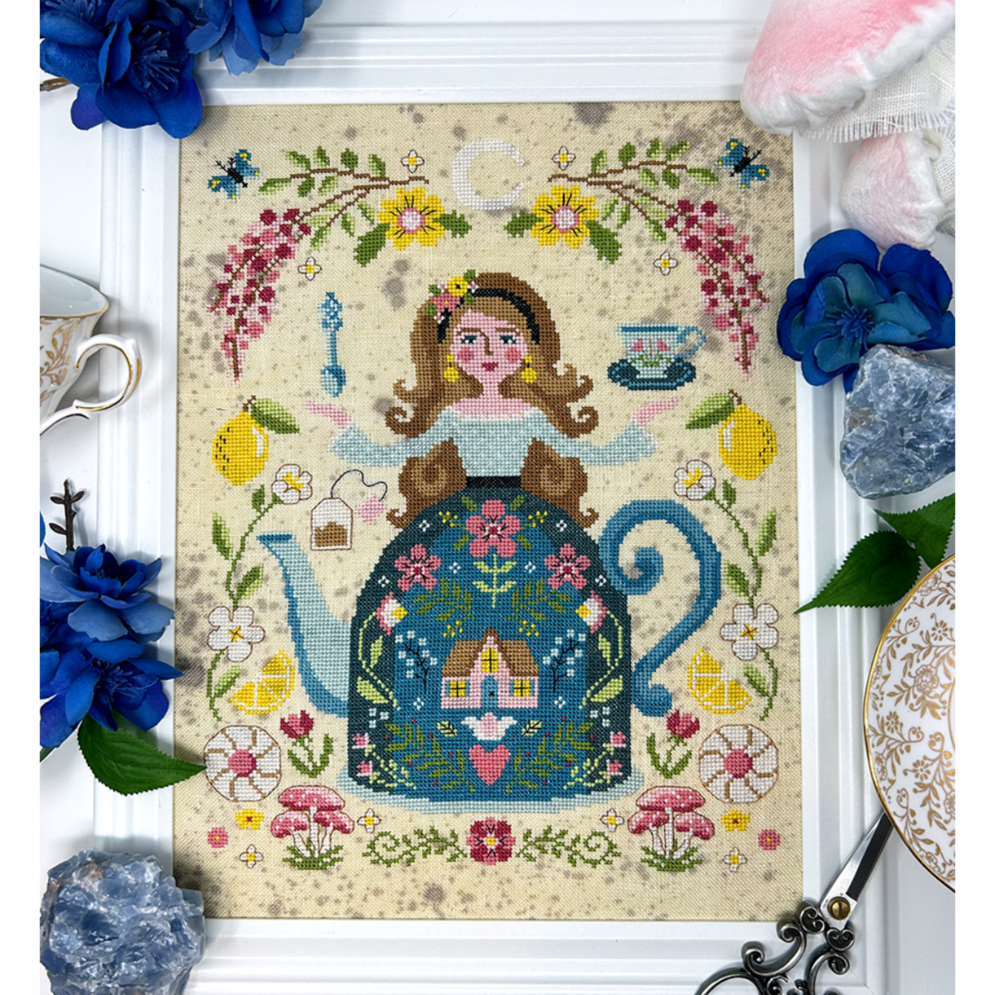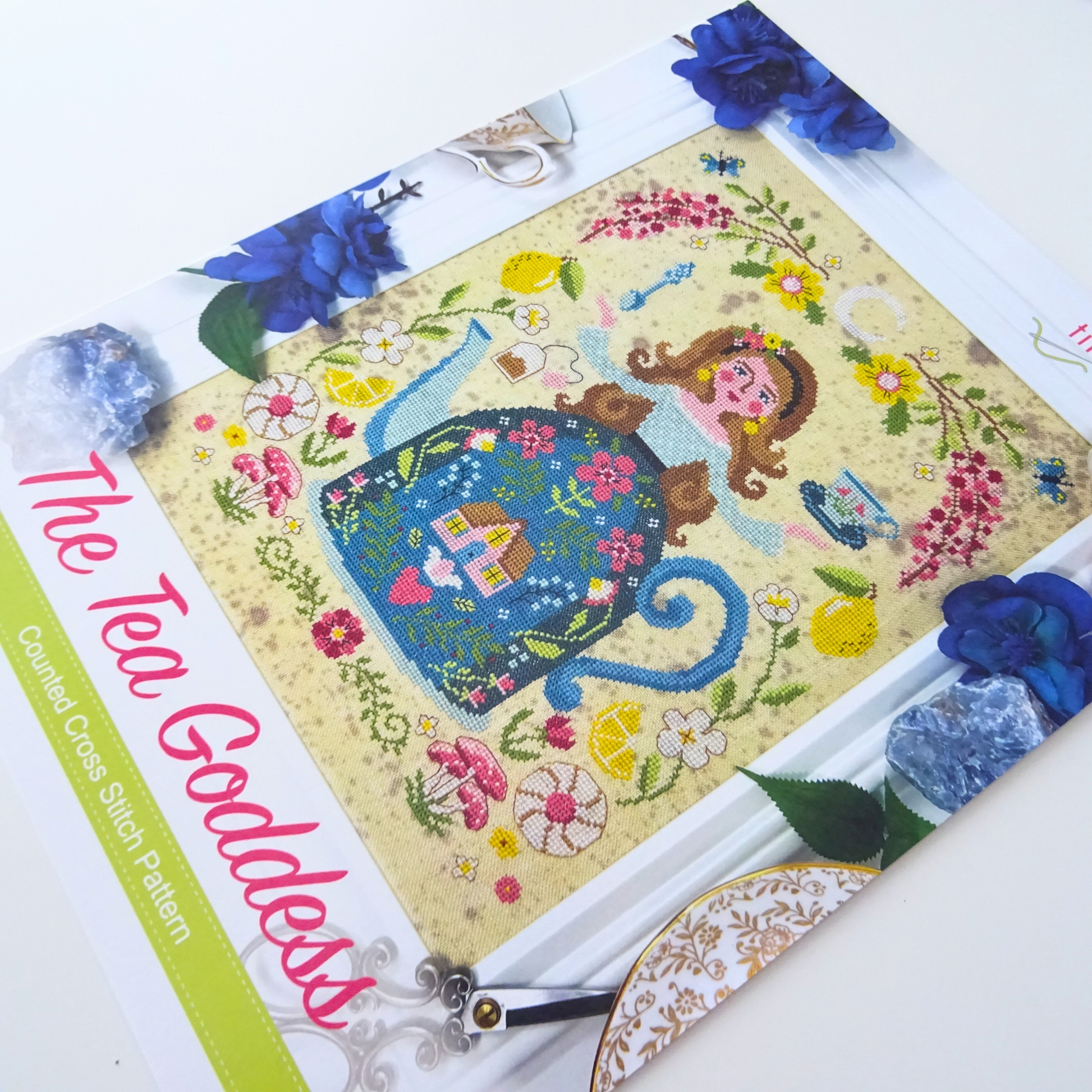 The Tea Goddess counted cross stitch pattern by Tiny Modernist. This chart was released in August. This chart shows the Tea Goddess in the centre surrounded by lemons, spoons, tea cups, mushrooms and the moon.