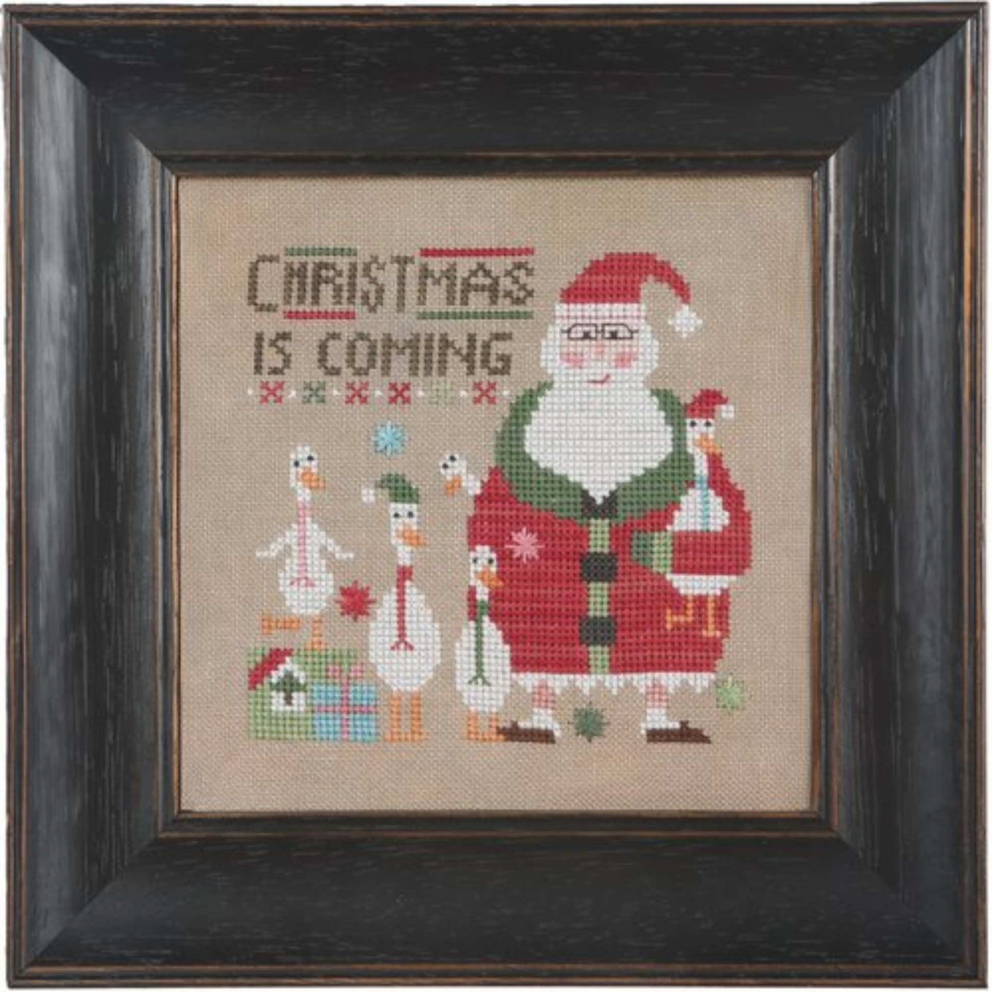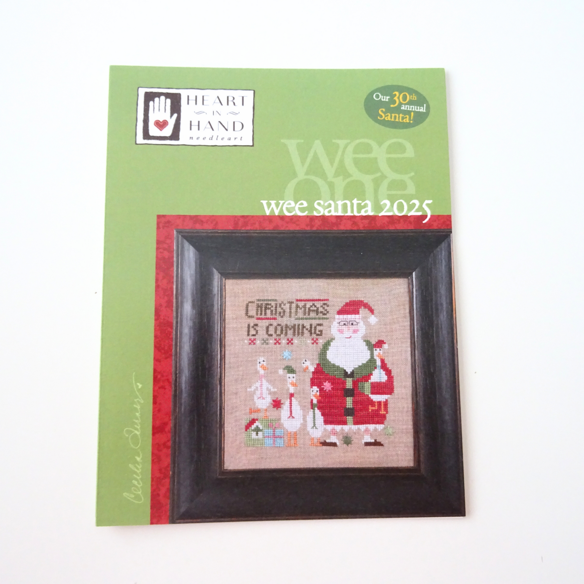 Wee Santa 2025 counted cross stitch pattern by Heart In Hand. This is 30th annual Santa from Heart in Hand. It shows a brilliant Santa with a large white beard surrounded by his geese friends and gifts.